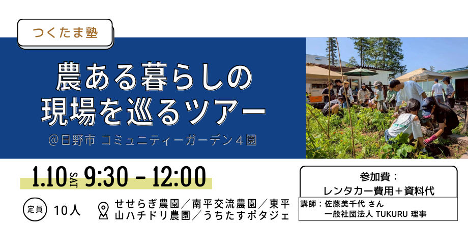続きを読む2025年6月に開催したつくたま塾「農のある暮らしづくり~都市の農と市民を繋ぐ日野市の取り組みから~」の現場を巡るツアー「農ある暮らしの現場を巡るツアー@日野市」を実施します。 現地では、日野市のコミ …